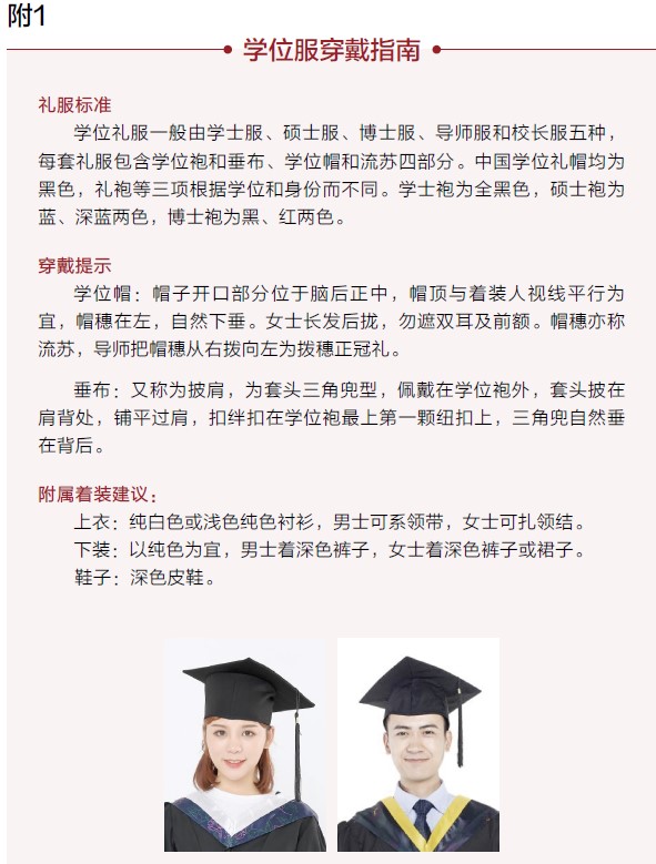 2、毕业典礼着装庄重,避免运动、休闲服装。大家典礼合影时,由于时间长、天气热,服装不宜太厚,以免摄影时引起身体不适。