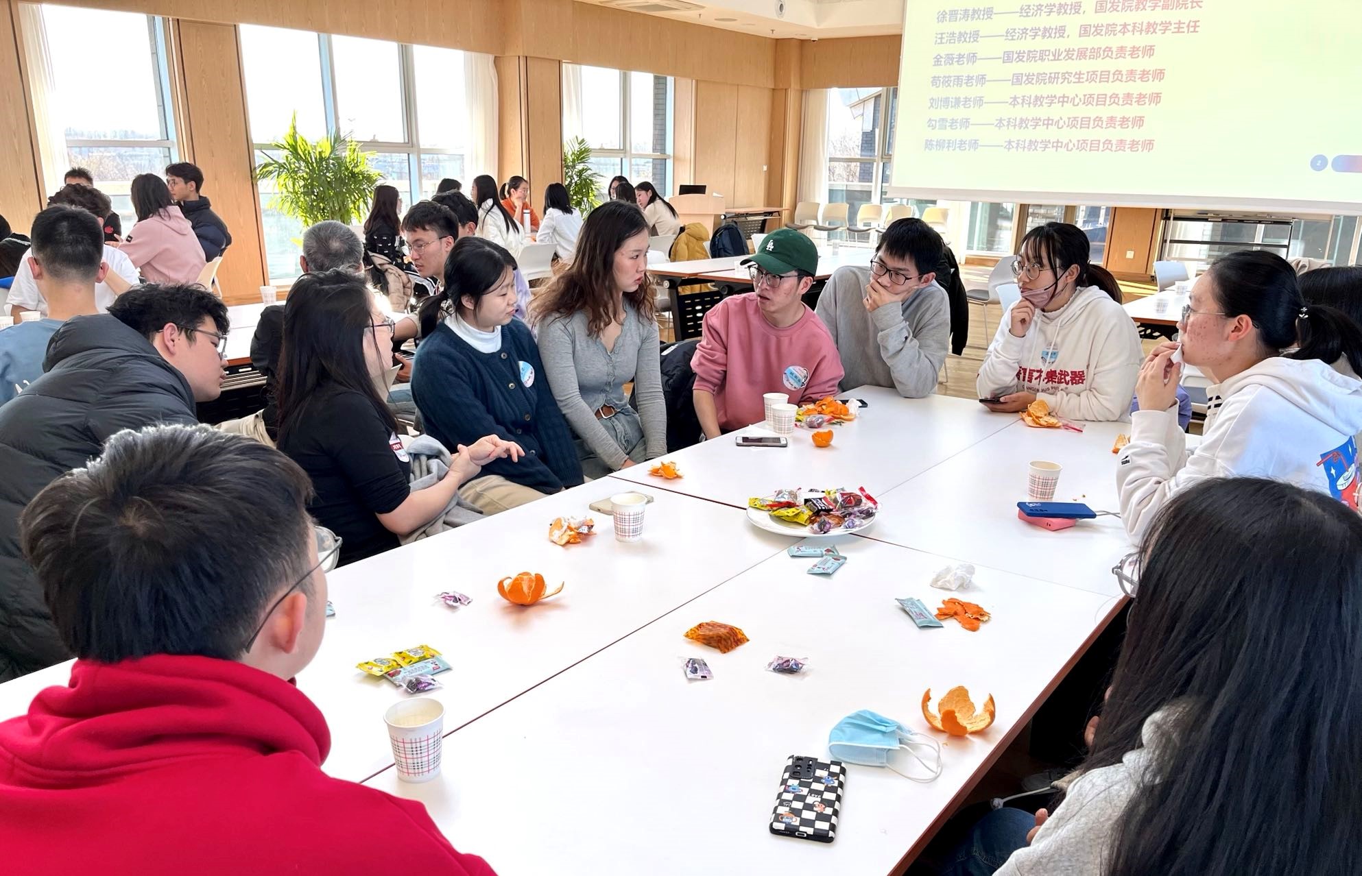 紧接着徐教授把时间留给了同学们提问。五位同学分别请教了关于本科生科研、小语种专业如何与经济学结合做相关研究、工科专业学习经济学的优势及经复项目的前景的问题。徐教授分别给予了针对性的解答和展望,刘博谦老师、勾雪老师、陈柳利老师也分别做了相应方向的补充回答。