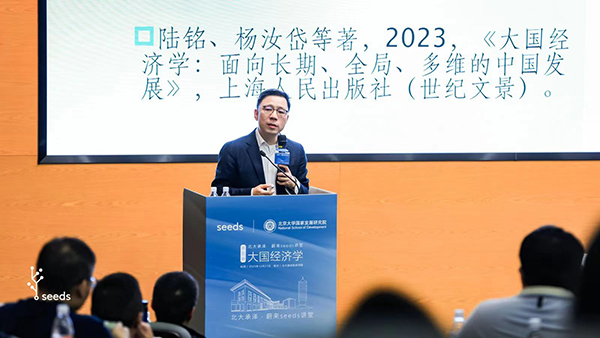2023年10月21日晚,北大国发院与蔚来seeds公益项目联合主办“北大承泽-蔚来seeds讲堂”第4期,特邀上海交通大学安泰经济与管理学院特聘教授、长江学者、中国发展研究院执行院长陆铭,以及北京大学博雅特聘教授、长江学者、北大经济学院杨汝岱,以“大国经济学”为主题,基于新书《大国经济学:面向长期、全局、多维的中国发展》,解读中国经济过去增长的密码,并分析未来发展方向。