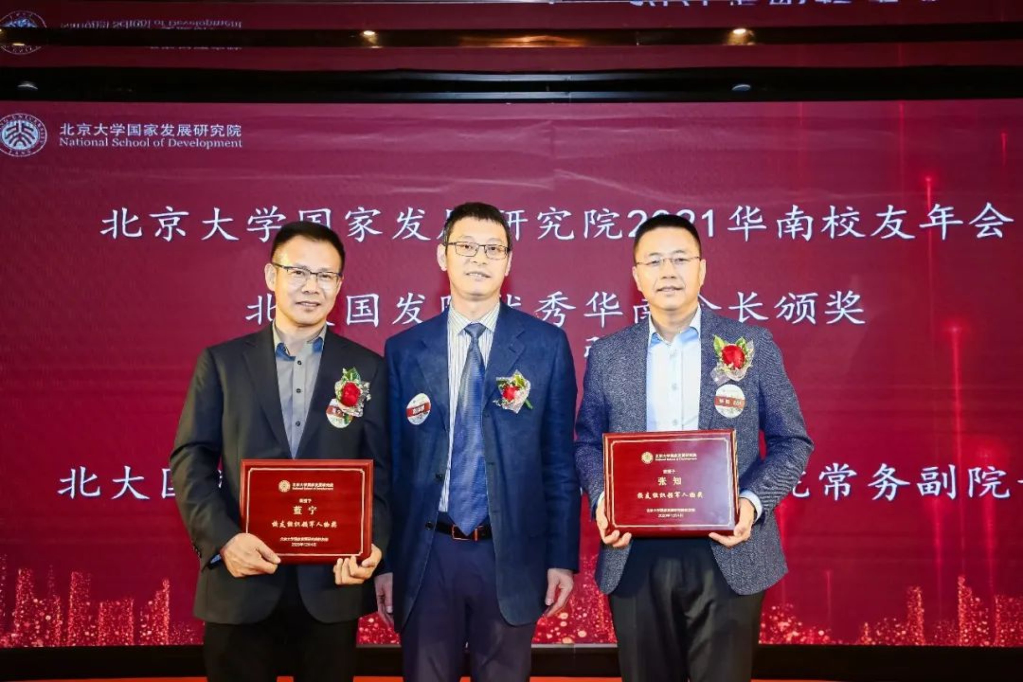 北大国发院助理院长范保群为总会长蓝宁、 轮值会长张知颁发了校友组织领军人物奖 。