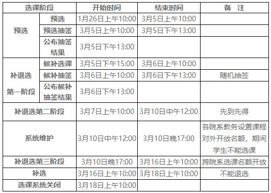 6.所有本科生请在学校规定的时间内进行选课,退课、补选及相关课程调整,选课结束后,选课系统封闭,学生将不能再进行网上操作。第三周学校公布最终选课情况,请登录校内门户-办事大厅-我的课表查询。
