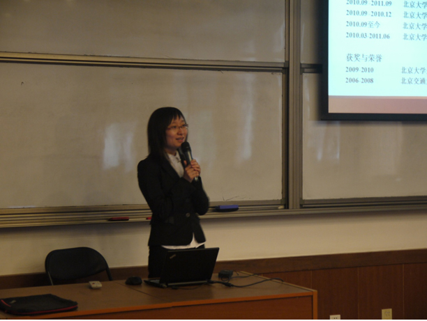 吴鸾莺同学以“饮水思源,服务大家”作为她演讲的主题,她回忆起第一次来到致福轩是在2007年的春天到中心参加校外经济学双学位的推介会,此后到中心修读双学位至今已有4个年头。她提到自己在中心的4年时间收获了许多东西,来自老师、同学对于经济学的热情、对待学术的严谨、对于人生的态度都使她深受鼓舞,所以决定在中心继续读博士。她回顾了自己读研究生以来的成长,认为研会是一个非常重要的沟通交流平台,能够组织各方面的资源为同学服务。因此,她研二加入了学术部参与各种活动,并希望今后能够继续留在研会,饮水思源,更好的为大家服务。吴鸾莺同学提出自己今后的工作除了继续传承中心的交流、讲座、文体等传统活动以外,还计划举办一些新的活动,诸如博士校友的交流,要请毕业的博士们分享他们的求职经验、做学术的体会;请高年级的同学们分享实习的经验并利用好他们所有的资源;另外,她还谈到,中心是个卧虎藏龙的地方,每位同学都是敏而好学的,可以利用书友会的形式组织同学把自己喜欢的学术或者非学术的好书拿出来与大家分享,可以通过群邮、FTP等方式进一步丰富中心的学术资源,让每个人都受益。最后,吴鸾莺同学表示无论自己是否当选,都希望在研会和大家一起在研会为同学服务,让中心这个大家庭越来越好。