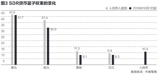 回头看,对于人民币的国际化,人民币加入SDR,欧洲国家似乎是欢迎的。比如说,人民币在SDR中的权重,主要是欧元和英镑让渡的。图3显示,2016年10月1日人民币加入SDR货币篮子之前,欧元和英镑的权重分别为37.4%和11.3%。人民币加入后,二者的权重分别降为30.9%和8.1%,分别下降6.5和3.2个百分点,二者共下降9.7个百分点,占人民币权重(10.9个百分点)的89%。而SDR原来的另外两大货币——美元和日元,其权重则分别只下调0.2和1.1个百分点。背后的博弈和调整可能很复杂,细节不得而知,但人民币的权重主要来自欧元和英镑,却是写在纸上的。