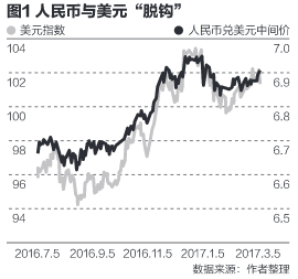 图1和2说明,从2016年7月开始,人民币汇率基本独立于美元,与美元“脱钩”了。