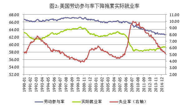 失业率这几年虽然在降低,从2009年10月的10%下降到现在的5.1%,但是劳动参与率一直在下降(图2)。这样,考虑到劳动参与率之后的实际就业率,也就是就业人口占适龄劳动人口的比重,只有轻微的复苏,现在依然只有59.5%左右,远远低于1990年代以来的62-64%的波动区间。