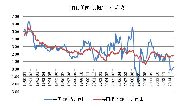 根据国会授权,美联储有两大职能:一是充分就业,二是物价稳定。先来看物价(图1)。美国核心通胀这几年一直在2%的长期目标以下徘徊,现在保持在1.8%的低位。而且,由于石油价格的下滑,扣除石油和食品的非核心通胀更低,现在只有0.2%。倘若石油价格进一步下滑,通胀下行的压力依然存在。更重要的是,1990年代以来,美国的通胀水平在波动中下行,趋势延续的话,应该继续下行,至少看不到上行的压力。