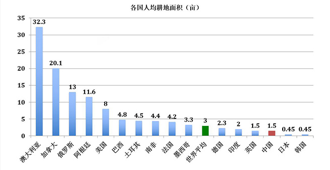 这不奇怪。我国的基本国情是,虽然“地大物博”,但架不住“人口众多”。一平均下来,人均资源紧张,耕地也一样。根据尚未完全公布的第二次全国土地调查(即“二调”),我国耕地面积大约20.3亿亩,人口按13.5亿计算,算下来人均约1.5亩,只有世界平均水平(约3亩)的一半。
