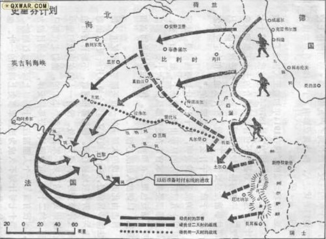 与此同时,在西线,施利芬决定以梅斯为中轴,将德军分为担任守势的左翼和担任攻击的右翼。由于法德之间存在着阿尔萨斯和洛林的领土争端,战争发起后,法军一定会以主力向东进攻,夺取这两块地区。这一地区全是山地,德军完全可以用部分兵力部署在梅斯以南至瑞士边界,构成西线的左翼,依托有利地形采取守势,最大程度阻滞法军主力的进攻。而德军的主力也就是西线的右翼,则在梅斯向西北至韦瑟尔一线展开,通过中立的低地国家,出其不意地突破没有设防的法国北部边境,随后沿海岸线向南实施大范围迂回,在鲁昂附近渡过塞纳河,然后折转东南,绕过巴黎,将法军主力压向东方,迫使其退至法国与瑞士交界的摩泽尔河附近。这样,德国的攻势就可以将法军主力置于“铁锤”(右翼)与“铁砧”(左翼)之间,给法军以致命的打击。