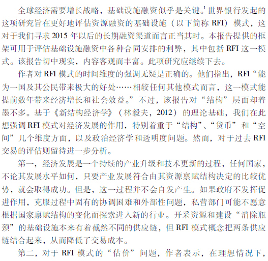 林毅夫,王燕关于《资源融资的基础设施(RFI)》一书的评论