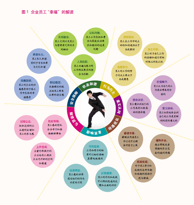 其实,不管企业利润与员工幸福谁是手段谁是目的,抑或同时都作为目的时二者之间如何去平衡,员工的幸福感这一话题,都是值得我们关注的,而要真正评鉴和理解当代企业中幸福员工与幸福企业的这一概念,必须在一个整体架构中,对这个概念进行全要素的分析与观察。笔者认为,这个框架主要应该包括如下要素:状态和谐、行为自主、意义认同、待遇优良、影响显著、期望适当、安全保障等( 图1)。
