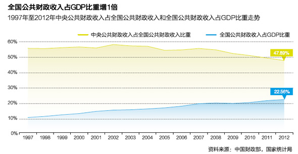 根据公布的统计,1990年-2012年22年间,财政收入增长了38.9倍(其中中央财收增加了55.6倍)。同期GDP总量(以现价计)仅增加了26.6倍,而城镇居民可支配收入与农村居民人均纯收入只分别增加15.3倍和10.5倍。