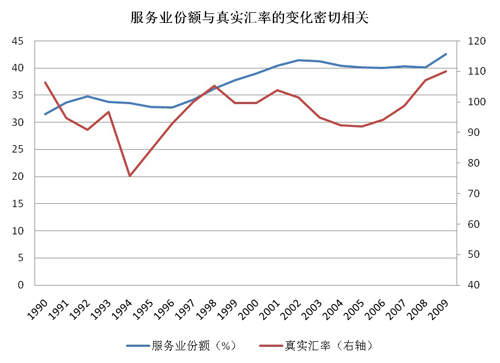 最近发生的一个新变化值得注意:2009年服务业的份额从2008年的40%大幅上升到42.6%,一年间猛涨2.6个百分点。而在此之前,这一份额自2005年起停止下降,徘徊在40%的水平,直到2009年大幅上升。这与2005年7月开始的人民币汇率改革以及随之而来的人民币汇率止跌回升,在时间上大致吻合。