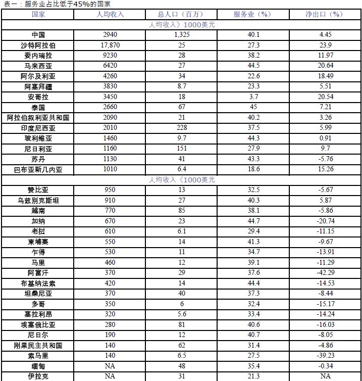 表一(见下页)列举的是2008年世界上所有服务业占GDP比重低于45%的国家。这个比重是低收入国家的服务业平均占比,所以表中的国家都是服务业发展水平极低的。为节省空间计,我们不考虑总人口500万以下的小国。表中国家按收入排序,并以人均收入1000美元为界,把它们分成两组——1000美元大约是世界银行的低收入国家和中低收入国家的分界线。所有数据来自世界银行发展指标数据库。
