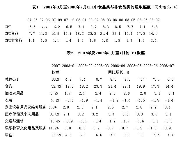中国的通货膨胀率在2007年3月还是3.3%,经过一路攀升,攀高到2008年2月的8.7%,而2008年7月又回到6.3%。以上的数据是根据国家统计局所公布的CPI同计算所得到的结果,对于非专业人士而言通胀所代表的是生活成本增加,对于专业人士而言,分析通胀的原因以及提供对策责无旁贷。根据文后表1的数据,从2007年3月开始,CPI中的食品类通胀的幅度要远高于非食品类的通胀幅度,许多所谓的专业人士会得到以下的结论:通胀的原因在于食品类的价格快速上涨。言下之意,只要抑制食品的涨价,通胀的问题就可以解决了。