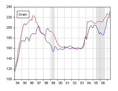 其实,此次肉价上涨,发生在2005年7月到2006年10月间一个较长的肉价下跌的阶段之后(相对于粮食价格的变化而言)。附图为1994年以来肉禽及其制品价格的变化(相对于粮价变化)有两个比较异常的时期,一个是2005年7月到2006年10月,另一个是1999年4月到8月(附图中的阴影部分。图中最后两个数字为2007年5月的价格,是作者估计的)。季节调整后居民消费的粮食和肉禽及其制品价格指数(1993年平均为100)