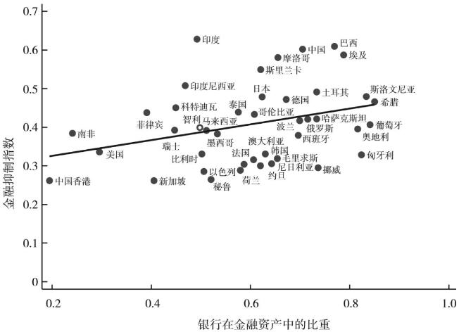 图1 各国金融体系比较:金融抑制与银行占比,2015年