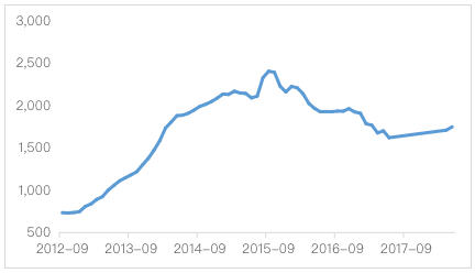 图2 影子银行发展情况,2011年-2018年(万亿元)