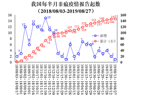 首例非瘟报告后疫情以超出预料速度快速散发传播。下图整理国内有关部门和OIE资料显示,从去年8月初到今年8月底一共发生了近150起非瘟疫情,31个省市自治区都有疫情报告。报告疫情发生频率最高时段是去年9月到年底约4个月前后,其间共报告疫情90起,占观察期报告疫情总数六成以上,该时段平均每月发生约22.5起。今年1-8月总共发生57起,平均每个月约7.1起,比此前四个月下降近七成。今年8月报告疫情3起,9月10日报告宁夏最新一起。从公布疫情数据看,今年入夏以来我国非瘟疫情肆虐情况已经得到控制,总体形势趋于稳定。