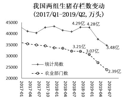 下图报告统计和农业部门提供的生猪存栏数季度变动情况。从2018年3季度到今年2季度一年间,统计局数据显示生猪存栏从4.29亿头减少到3.48亿头,下降8100万头;农业部数据从3.21亿头减少到2.39亿头,下降8200万头;两个数据系列降幅分别为18.9%和25.5%。如果考察2018年4季度到今年2季度9个月时段情况,统计局数据显示生猪存栏下降8000万头,农业部数据减少6800万头,降幅分别为18.7%和22.1%。
