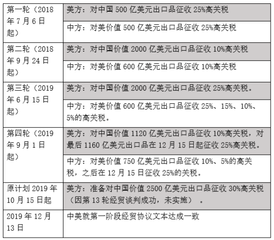 在回答上述问题之前,我们首先通过回顾中美贸易摩擦的动态演变,来加深对中美经贸关系现状的了解。中美贸易摩擦已经有不短的时间,中间伴随着起伏和升级。按照我的理解,中美之间的贸易摩擦已经有四轮半,是一个动态演变的过程,如下表: