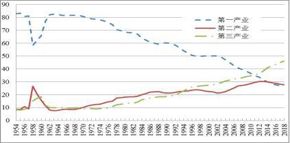 但是2012年之后,工业就业达到顶峰之后开始下降。为什么不是2008年、2009年?因为有4万亿投资的刺激。接着我们又往上冲了几年,达到了工业化顶峰。一个国家的产业转型大都跟外部冲击有关,日本就是如此;韩国和台湾地区比较平稳一些,上世纪80年代末开始去工业化,但是经济转型要等到亚洲金融危机之后。我们国家受金融危机冲击挺大,估算去工业化大概提前了5、6年时间;如果没有金融危机,可能工业化还可以持续到2017年、2018年。顺便说一下,工业就业最高峰在这里显示的是30%,这个数字恐怕不准确,农业的份额高估了。我觉得最高峰的时候,工业就业应该达到过全部就业的35%,这个和其他成功的经济体没有太大差别。