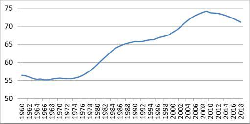 图4 劳动年龄人口比率(15 - 64岁人口占总人口比例):1960 – 2018年(%)