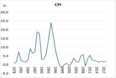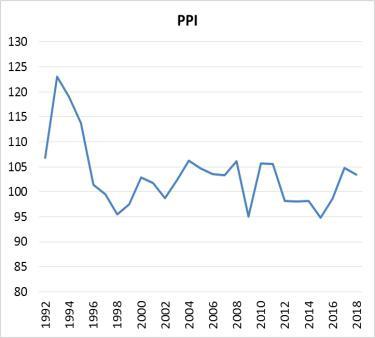 资料来源:国家统计局网站www.stats.gov.cnPPI的统计更容易,因此周期就更明显。在图6的下边这张图中,100表示生产者价格和去年没有变化,超过100就是通胀。1998年之前,PPI是显著高于100,通胀压力很大;1998年到2002年,PPI基本上都低于100;2003 – 2012年,除2009年之外,都高于100,之后下来了,然后到2017年又变成正的,但过去这几个月又变负了。从历史数据来看,PPI是比较准确的,对经济表现有先导的意味。