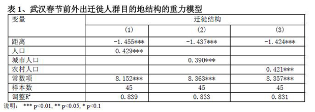 表1报告用重力模型对几百万武汉节前外出迁徙人群目的地流向占比值的回归结果。各地与武汉距离以及人口变量估计系数符号都符合事先逻辑推测方向,估计系数都在统计上高度显著。距离系数在 [-1.45, -1.42] 区间内,意味着其它条件给定,特定地区与武汉距离增加1%,该地区病例数会增加1.42-1.45个百分点。各地人口、城镇人口与农村人口等体量指标估计系数分别为0.43、0.39、0.42,显示给定与武汉距离等其它条件,特定地区人口规模增加1%,武汉节前迁移者到这个地区人数会增长0.4%上下。其中农村人口估计系数略微大于城市人口,或许反应离汉迁徙者中来自外地农村在武汉工作回家过节的人数较多。