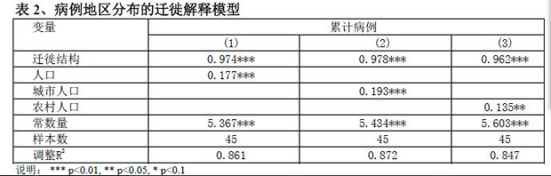用重力模型分析武汉节前500万外出迁徙目的地空间分布特点基础上,继续考察武汉节前迁徙结构对新冠肺炎疫情空间分布特点的影响。疫情地区分布模型除了包括武汉节前迁徙变量外,还包括人口及其结构指标考察迁徙变量之外可能影响疫情区域分布的因素。表2报告估计结果显示,两个变量估计系数符号方向符合预期,估计系数在统计上高度显著,不同模型估计调整R2值达到0.87上下,提示包含两个变量的简单模型能解释绝大部分用病例数度量的新冠肺炎疫情区域分布相对差异。