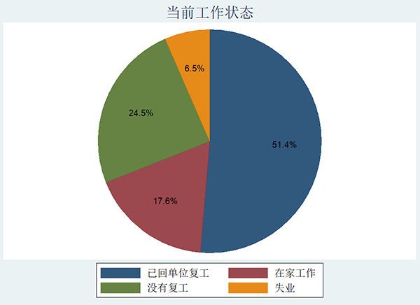 网络调查数据显示(见图1),截至3月2日全国已有51.4%的城镇就业人员“回到单位复工”,但这并不意味着全职复工。这51.4%复工的被访者估计其工作量只达到2019年同期水平的88%。图1还显示有17.6%的劳动者在家工作,他们的平均工作量为2019年同期的62.6%。仍有24.5%的从业者处于未复工状态;剩余6.5%处于失业状态。