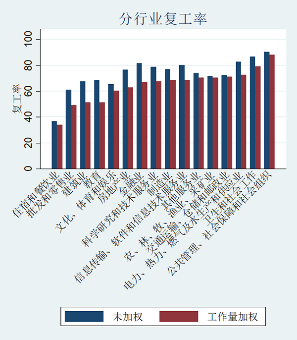 分户口类型来看,城镇劳动力复工率为73.1%,农民工的复工率仅为61.8%,经工作量加权后分别为63.3%和54.4%。农村外出务工人员是我国服务业和制造业的主要用工来源。而其如此低的复工率意味着全国的基本经济状况仍不容乐观。全国工业企业复工率为75.3%,经工作量加权后为64.3%,远低于同期官方公布的规上工业企业复工率95.6%。