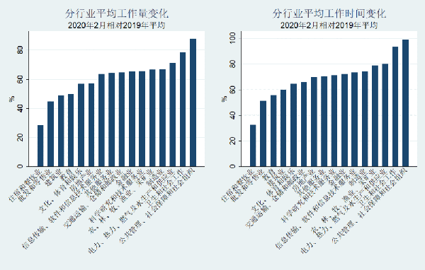 如果按劳动时间计算,2020年2月的平均工作量与2019年平均月工作量相比(图3左图),我们可以得到同样的结论:疫情对“住宿和餐饮业”、“批发零售业”、“建筑业”和“教育”行业从业人员的冲击最大,对“公共管理、社会保障和社会组织”和“卫生和社会工作”负面影响最小;甚至从工作时间变化来看,这两个行业从业人员的工作时间几乎相当于去年平均水平。图三右图是个人填报的目前工作量与2019年平均月工作量的比较。尽管使用不同指标测度工作量变化,而左右两图结论一致。