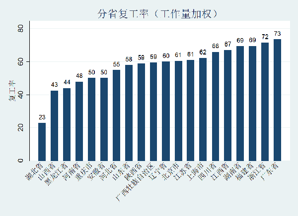 从分省的复工率来看(见图4),广东和浙江两省的复工率最高,超过70%,辽宁、北京、江苏、上海、四川、江西、湖南、福建为60-69%,湖北由于受疫情影响最为严重,其复工率最低只有23%。
