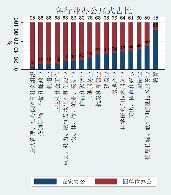 工作性质使得不同行业从业者在家办公的呈现显著差异(见图5)。由于各级学校尚未开学,“教育”行业从业者“在家工作”的比例高达85%;其次,“信息、软件”行业从业者有一半在家开工;而“政府工作人员”、“交通运输物流”行业从业人员、“制造业”和“医务工作者”在疫情期间却更多地走出家门到单位工作。