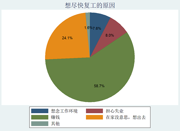 图6显示,没有回到单位工作的人群中,51%的人非常想尽快恢复正常工作,而最主要的原因是“赚钱”的压力(占1/2以上)和“在家没意思,想出去”(占1/4以上)。