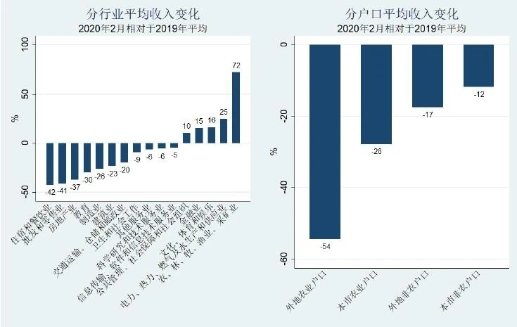 在漫长的防疫期,是否能复工、复工的程度对个体收入存在至关重要的影响。为了验证这一关系,我们在网络调查中收集了2020年2月和2019年的平均月收入,并将个体的收入变化定义为“(2020年2月收入-2019年平均月收入)/2019年平均月收入”。如图1所示,大部分行业从业人员收入都较去年平均水平有所下降,其中“住宿和餐饮业”从业者的平均收入冲击最大,为42%;其次是“批发和零售额”从业者月收入平均下降了41%;“房地产业”、“教育”行业从业者的收入下降也在30%以上。分户口类型看,农民工群体的收入冲击最大,月收入平均下降了54%。