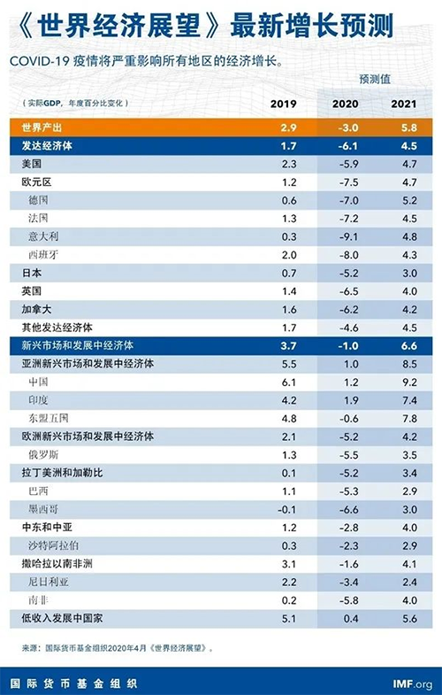 在上图中,您可以看到发达经济体受到的负面影响及冲击更为明显(下降6.1%),而新兴市场和发展中经济体下降温和一些(下降1.0%)。今年的世界经济毫无疑问将受到疫情的严重影响。