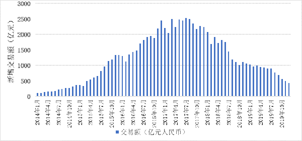 个体网络借贷的交易额在2014年初至2019年10月这段时间,整体上也是先增长后回落,峰值出现在2017年上半年,然后回到与2015年初相当的水平。