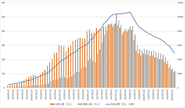 待还余额是平台尚未还给投资人的金额。随时间变化,出借人(橙色柱状)、借款人(灰色柱状)和待还余额(蓝色线)三者的变化反映出:1.三者都经历了先升后降的过程;2.在交易规模达到顶点之前,借款人数少于出借人数,之后则相反;