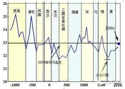 古气候学家竺可桢先生做了一张图,描绘了中国近三千年气温的变化曲线,后人又补充了近几年的气温数据。