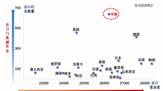 还有一点是在外部冲击这么剧烈的情况下,中国出口占世界份额仍在上升,中国进口占世界也在上升。这些现象都是我们在外部冲击发生之前难以想象或者说难以进行预测的。一个可能的解释是中国在出口门类的齐全性和出口产品技术复杂度方面都占优势位置(参见下图)。并且,在明年或者后年,中国有可能成为世界上最大的内需市场,超过美国。
