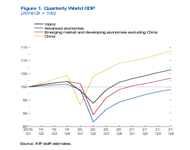 因为中国经济是一支独秀,一季度虽然有微型的下跌,但反弹后现在已在平稳增长了。根据IMF的判断,在2021年的第四季度全球将走出疫情冲击的影响。因为根据蓝色的线,在2021年第四季度时,发达国家开始接近原来100%的初始水平了。