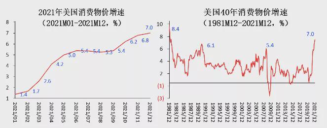 美联储提前启动和加快退出超宽刺激政策,更是超预期通胀压力上升倒逼的产物。下面左图显示2021年消费物价增速月度同比数据,从年初1.4%增长到年中的5%左右,已显著超过美联储目标值;四季度通胀水平继续上台阶,10月破6后在11月增至6.8%,12月最新数据升至7%,创下上世纪80年代初以来40年最高月度增速(右图)。在事实面前得美联储不得不承认通胀持续性超出其早先预判与模型预测结果,并进而放弃“通胀暂时论”立场,提前启动并加快调整2020年疫情大流行以来超宽货币政策。