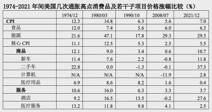 其次比较近半个世纪发生的五次通胀,目前通胀另类性表现为物价上涨构成特点。下表显示,就物价涨幅衡量的通胀程度而言,美国去年12月消费物价同比增速7%,高于1990年和2008年通胀月度峰值(6.3%和5.6%),低于1974年和1980年通胀水平(12.3%和14.8%),还不算很出格。价格变动某些方面与历史经验形态也有类似之处,如通胀时能源价格涨幅大幅高于整体物价,食品价格涨幅与整体通胀比较接近等等。本次通胀最重要结构特点是商品价格相对涨幅超常。