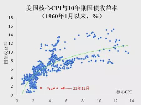 再次去年美国通胀另类特征表现为通胀飙升与国债收益率之间不再具有常态性正向关系。一般情况下通胀压力上升时美联储会及时加息应对,甚至出于先发制人策略考虑提前紧缩货币政策,联储基准政策利率走高带动市场各类利率包括国债收益率上升,导致如下图1960年以来月度数据所显示的通胀与收益率之间正向关系(蓝色样本点)。去年通胀超预期飙升,美联储囿于通胀短期论分析立场并受制于超大规模量宽政策的技术性牵制,不愿也不便及时采用加息等紧缩手段应对,结果使得通胀变动与收益率暂时脱钩,表现为下图红色样本离群点的非典型关系。