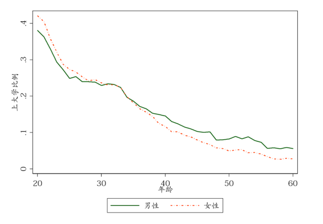新中国女性就业率一直高于发达国家。改革开放以来,女性的就业率略有下降,但是仍然很高,2010年人口普查显示,25—49岁人群中,男性的就业率为94.2%,女性为80.5%。受过高等教育的女性就业率尤其高,比未能受过高等教育的女性高出将近20个百分点。同时,女性的教育程度相比于男性有了很大的进步,从1982年左右的出生组开始,女性上大学的比例甚至超过男性(见图3)。这说明,就业对于中国女性很重要,她们有就业的意愿和能力,如果因为生育而放弃工作,就会发生机会成本。