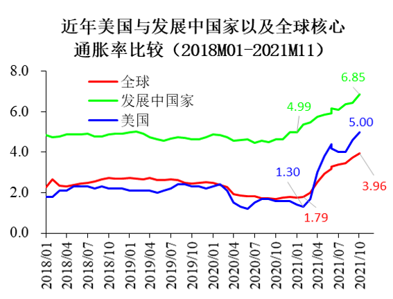 实际情况是两方面因素共同对通胀发挥了作用。下图有关近年美国、发展中国家和全球核心通胀数据,或许有助于说明美国新通胀的双重根源。数据显示2021年美国、发展中国家与全球通胀都显著提升,去年全球范围比较普遍的通胀现象,体现了上次评论中讨论的疫情演变第三阶段推高通胀的影响(“疫情经济学和美国新通胀”),这方面情况与疫情通胀论观点在逻辑上比较一致。但是下图还显示美国去年通胀相对增幅要高得多,应与美国超强刺激政策对其通胀产生特殊影响有关。