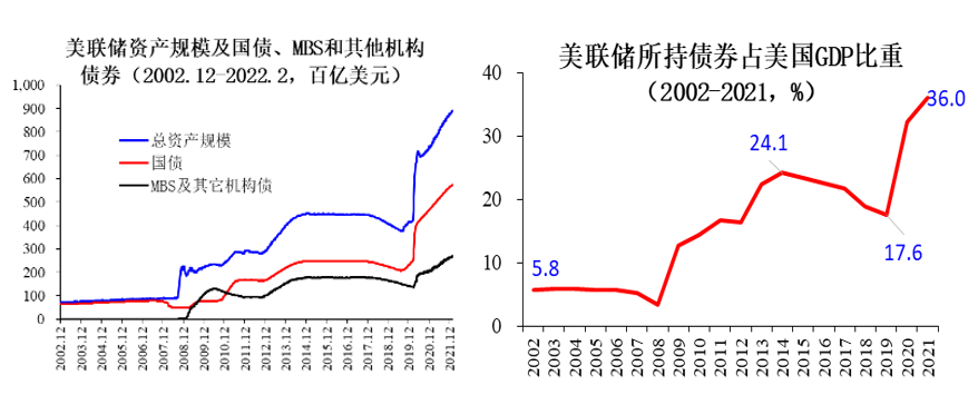 数据显示,新一轮货币刺激的绝对和相对规模远超上次危机应对。例如美联储持有债券从2020年初约3.8万亿美元扩大到2022年元月底8.3万亿美元,2022年元月底比2017年上轮量宽4.26万亿峰值高出94.8%。国债规模从2020年2月底2.5万亿美元增长到2022年2月中旬5.74万亿,最近规模比上轮量宽时2017年2.47万亿美元峰值高出1.21倍。MBS和其它机构债从1.37万亿增长到2.71万亿,目比上轮量宽在2017年达到的1.79万亿美元高出51.4%。同期美联储资产规模从4.2万亿增加到8.9万亿,比上轮量宽时该指标2017年4.48万亿美元峰值高出98.7%。(下面左图)。美联储所持债券占GDP比重从2019年17.6%增长到2021年36.0%,上升一倍有余,最近水平比上轮量宽时2014年24.1%峰值上升近12个百分点(右图)。