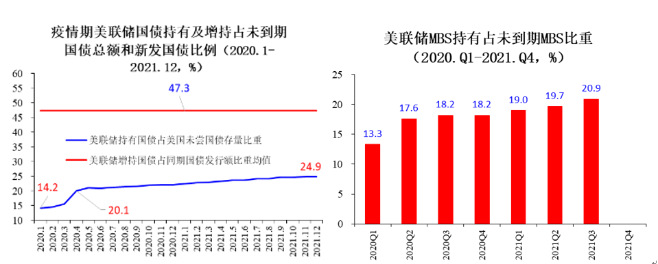 另外,美联储持有国债占未到期国债存量比例从2020年1月14.2%上升到2021年12月24.9%,过去两年美联储新增持国债数量占同期国债新发行量平均比重为47.3%(下面左图)。美联储持有MBS占未到期MBS证券存量比例从2020年1季度13.3%增长到2021年3季度20.9%(右图)。
