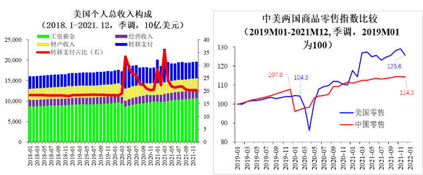 第一,主要由于财政转移支付增加,疫情期美国居民收入逆势高速增长,推动消费和经济强劲复苏同时也加剧供不应求及通胀压力。据匡算疫情期救济纾困法案向美国家庭个人提供的补贴收入大约相当于其2019年国内生产总值的十分之一。下面左图数据显示,从2020年4月到2021年12月美国居民月度总收入折年数均值,比疫情前2018-19年该指标均值增加13.8%,其中转移支付增量贡献了收入总增量六成以上。在收入高增长支持下美国消费快速复苏,下面右图显示疫情期美国商品零售恢复增长幅度远远超过我国。